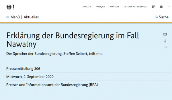 То, что Алексей Навальный стал жертвой атаки химическим нервным агентом в России, — пугающее событие. Федеральное правительство ФРГ решительно осуждает эту атаку. Российское правительство должно объяснить этот инцидент.