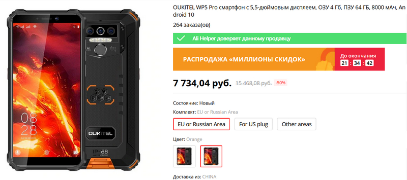 Модель - OUKITEL WP5 Pro. Смартфон этого года. Дисплей 5,5" HD IPS, платформа Mediatek Helio A25, 4/64 ГБ (совсем хорошо), NFC нет, камера 13 Мпикс Sony IMX214, аккумулятор аж 8000 мАч. Пишут также, что вроде поддерживает два диапазона WiFi. Влагозащита IP68&IP69K, сканер отпечатка. Весит он, конечно, прилично -370 граммов.
