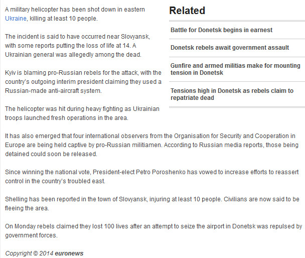 Сухая информация: повстанцы сбили украинский вертолет, украинские силовики обстреливают позиции ополченцев из "Града", бьют по жилым кварталам. Из города украинские силовики никого не выпускают.