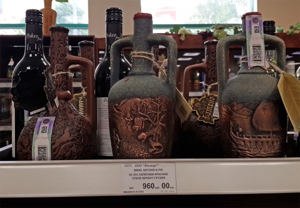В Москве появились вот такие грузинские вина. В конце девяностых, помнится, это были глиняные бутылочки по 300-400 рублей. Сама бутылка там стоила 290-390 рублей, а шмурдяк внутри - рублей 10.
