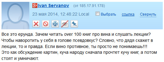 Там много интересного и полезного для тех, кто интересуется данной темой. Как научиться разбираться в вине, как выбирать вино, мифы о "подделках" винных марок, российское вино, как общаться с сомелье и что от них ждать или не ждать, как он сам, бывший программист, дошел до жизни такой.