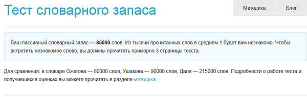 Любопытный тест словарного запаса от Григория Головина. Тест немного спорный, как и методика определения конечного результата, но интересный. Тем более что методика объяснена и вполне научная.