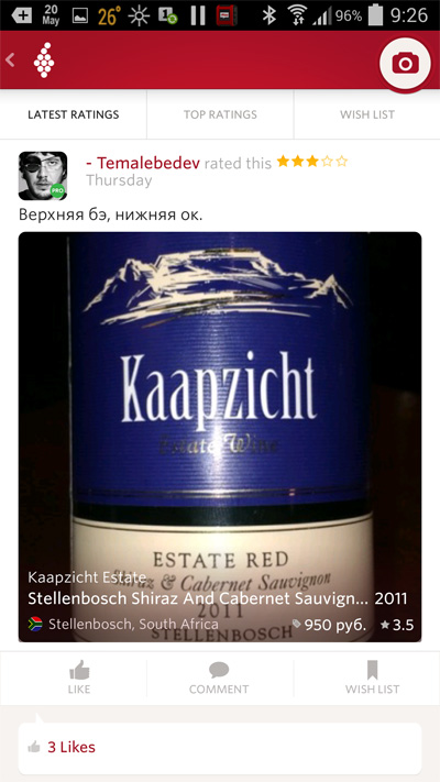 У меня там во френдах уже давно - Тема Лебедев. Тема любит хорошее вино, очень прилично в нем разбирается, пробует много нового, поэтому следить за его заметками - очень интересно, как я считал. (За моими заметками там тоже следит под пять сотен человек: уж и не знаю, интересно им или нет, тем более что я обычно просто оцениваю вино, а заметки пишу не в этой программе, а чисто для себя - в Evernote.)