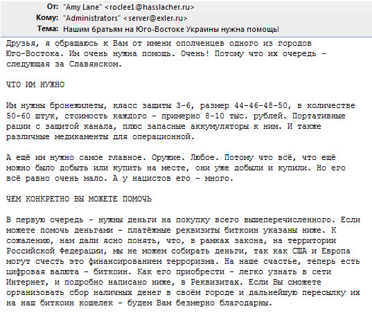 Появился новый вид "нигерийского" спама. "Ополченцы" из городов Юго-Востока просят биткоинов на покупку, ясный пень, оружия. Прелестно! Просто прелестно!