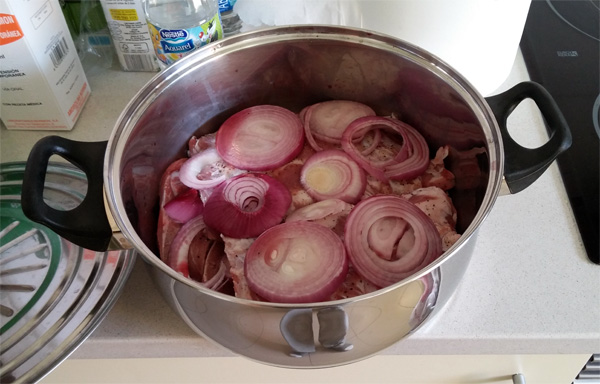Рецепт маринада очень простой: репчатый лук чистится, режется кружками, выкладывается слоем. На него - мясо, которое солится, перчится, туда добавляется немного чесночка (еще бы хорошо укропа, но где же его тут взять), а потом сверху еще слой такого же репчатого лука. Потом следующий слой мяса - и так далее. Лучше всего, чтобы постояло часов пять, не меньше. (А лучше вообще сутки, тогда будет самый супер.) Но если времени мало, всего два-три часа, тогда можно плеснуть туда стаканчик дешевого красного винца: так процесс маринования и выделения сока пойдет значительно быстрее. (Есть еще способ мариновать с нарезанными киви: способ известный и быстрый, но там от вкуса мяса почти ничего не остается, поэтому я его не использую.)
