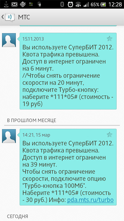 Меня этот МТС еще в прошлый приезд заколебал своими турбобитами-мегабитами. Я тариф не менял несколько лет, всегда спокойно пользовался Интернетом - с меня списывали деньги. Теперь через пять минут использования эти уроды блокируют Интернет и требуют через какие-то сообщения за какие-то деньги что-то там подключать. Поэтому я теперь в Москве в Интернет выхожу через модем Yota, который по крайней мере не требует ничего постоянно вводить и Интернет не отрубает.