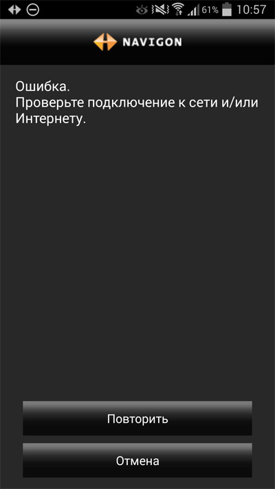 Интернет, разумеется, подключен и работает. Пробовал другую сеть WiFi, мобильное подключение - все то же самое. Смартфон перезагружал. Navigon переустанавливал. Все те же сны.