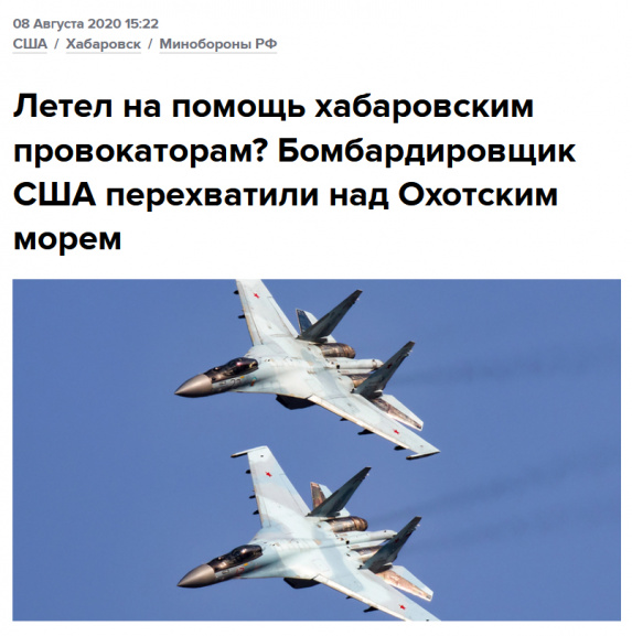 Кстати, никто этот бомбардировщик не перехватывал. Он летел над нейтральными водами, его в предупредительных целях сопроводили три российских истребителя. Но в "Интерфакс" не постеснялись поставить заголовок "Су-35С перехватили стратегический бомбардировщик США над Охотским морем", хотя в заметке сами же пишут: