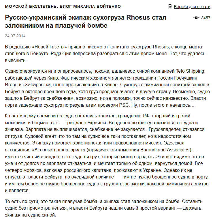 То есть сначала большого ума мужчина Игорь Гречушкин из Хабаровска решил перевезти 2750 тонн аммиачной селитры на неисправном корабле. Корабль в дороге сломался и причалил в порту Бейрута для ремонта. Большого ума мужчина Гречушкин на тот момент задолжал кредиторам кучу денег и фактически бросил корабль и груз на произвол судьбы, так что власти Ливана конфисковали корабль и груз.