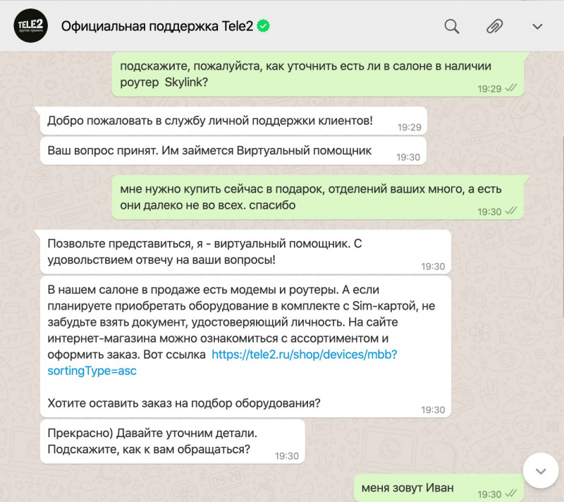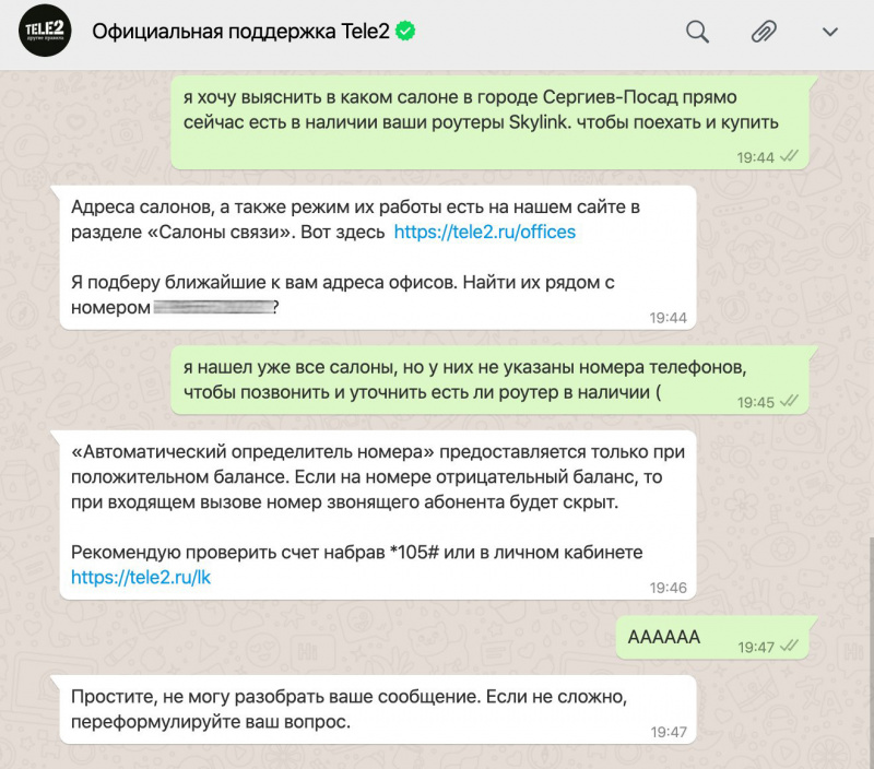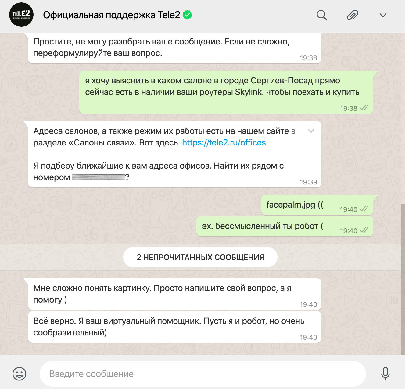 Искусственный интеллект по-прежнему в большом долгу. Иван Филиппов мучает чат-бота оператора Теле2: ему нужно узнать о наличии в конкретном магазине рутера Skylink.