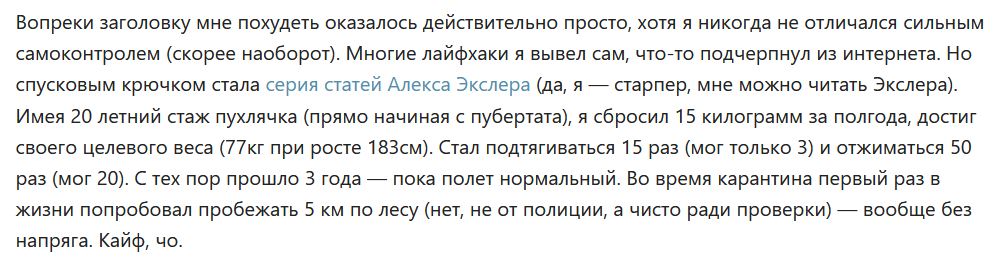 Смотрю - переходы на меня идут с "Хабра". Пошел посмотреть, откуда именно. Из статьи "«Просто похудеть» — непросто". Там вполне толково в очень сжатом виде излагаются основные принципы, о которых я рассказывал в своем разделе "Похудение" (позже все эти статьи были сведены в одну книгу, которую можно скачать).