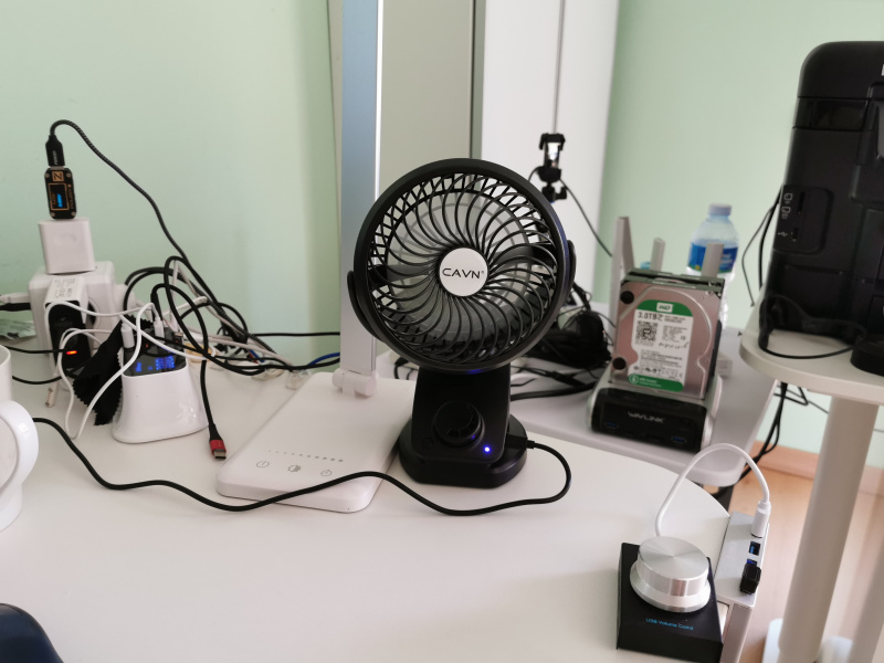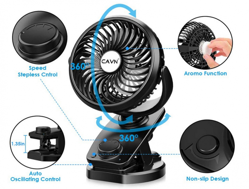 Главные прелести: очень компактный, на подставке плюс с прищепкой, головка с вентилятором крутится на 360 градусов, то есть его как угодно можно прицеплять: горизонтально, боком, вертикально. В широких границах регулируется скорость, причем на минимальных оборотах дует неплохо (если его недалеко расположить), а шума почти не производит. Есть автовращение на 90 градусов. В корпусе - аккумулятор на 5000 мАч, от него вентилятор автономно работает до 45 часов. И, кстати, работает как внешний аккумулятор - может заряжать смартфоны. В задней части вентилятора есть отделение для губки, пропитанной ароматическим веществом (две губки входят в комплект).