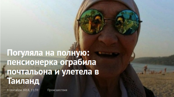 По Сети активно репостят текст о круто загулявшей пенсионерке, мне он уже раз в пятый попадается. Даже в "Новых известиях" перепечатали, причем, что пикантно, со ссылкой на какую-то новостную помойку. И Ыбыгдан перепечатал, причем со ссылкой на запись в Facebook, где ее перепостили из другого Facebook (ну, с Ыбыгдана-то чего взять...).