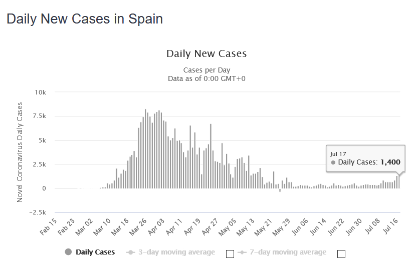 В Испании с начала июня ежедневно держалось где-то 200-300 новых случаев заболевания коронавирусом на всю страну, но за последнюю неделю пошел заметный рост, а позавчера и вчера было уже по 1400 ежедневных случаев.