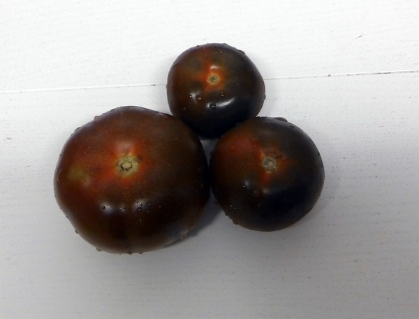 Я эти черные помидоры (tomate kumato) в испанских магазинах часто видел, но никогда не покупал - уж больно вид у них страхолюдный. Но один раз из любопытства купил, попробовал - и теперь только их и покупаю, они заметно вкуснее (на мой вкус, разумеется) обычных красных помидоров.