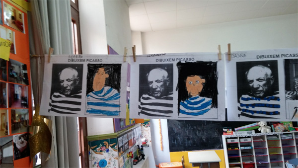 Дети 4-5 лет в каталанской школе рисуют Пабло Диего Хосе Франсиско де Паула Хуан Непомусено Мария де лос Ремедиос Сиприано де ла Сантисима Тринидад Мартир Патрисио Руис и Пикассо.
