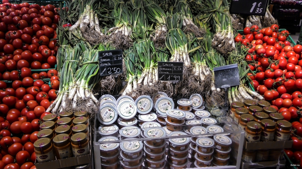 С середины января по конец апреля в магазинах Каталонии появляются вот такие колоритные наборы. Это лук-кальсот (разновидность зеленого лука), помидоры, чеснок и соус ромеско.