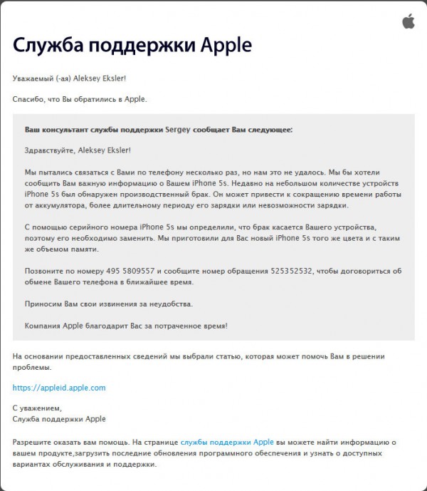 Получаю вот такое более чем странное письмо. В Apple я ни за какой поддержкой не обращался.