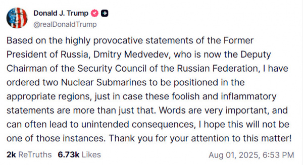 На основании крайне провокационных заявлений бывшего президента России Дмитрия Медведева, который в настоящее время является заместителем председателя Совета безопасности Российской Федерации, я отдал приказ разместить две атомные подводные лодки в соответствующих регионах на случай, если эти глупые и подстрекательские заявления окажутся не просто словами. Слова имеют большое значение и часто могут привести к непредвиденным последствиям. Надеюсь, что в данном случае это не будет так. Благодарю вас за внимание к этому вопросу!