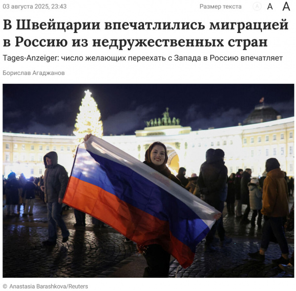 Пошел почитать. Ничем там, конечно, швейцарцы не впечатлились. Они просто пишут о явлении под названием "виза общих ценностей" - это особый вариант визы, которую получают соискатели, готовые подписаться под бумажкой о "разделении моральных и духовных российских ценностей", и тогда им разрешают жить и работать в РФ в течение трех лет без каких-либо условий: ни языкового теста, ни инвестиций, ни подтверждения профессиональной квалификации.