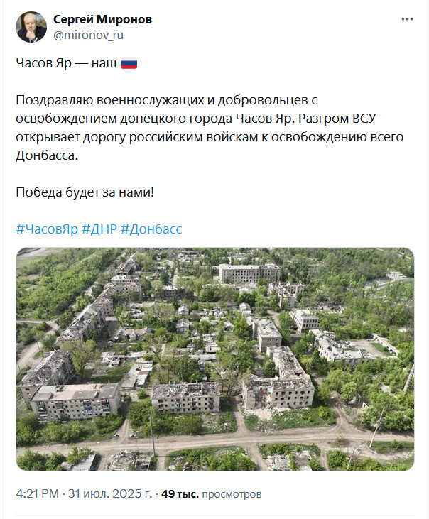 Сергей Миронов, руководитель клоунской фракции "Справедливая Россия", поздравляет с освобождением Часова Яра - города, с населением в 12 тысяч человек (это, разумеется, население до начала войны), который армия РФ пыталась захватить почти полтора года. За это время город был почти полностью разрушен российскими войсками, часть жителей была убита, другая часть покинула город. Вот с таким освобождением эта мразь Миронов военнослужащих и поздравляет.