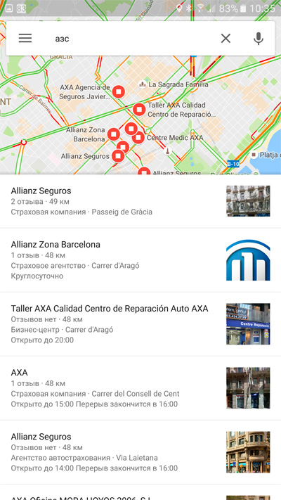 Ответ очень простой. В отличие от отдельных программ навигации, типа Navigon, Sygic и так далее, Google Map выдает не POI (точки интересов), а просто тупо вбивает в поисковую строку карты соответствующий запрос. То есть тычете вы в пиктограмму "АЗС" - она вбивает "азс" в строке поиска. Что вы получите по поиску "азс" в Испании, Италии, США или любой другой стране? Правильно, полную хрень. Вот, например, по Испании. Все что угодно, но не АЗС.