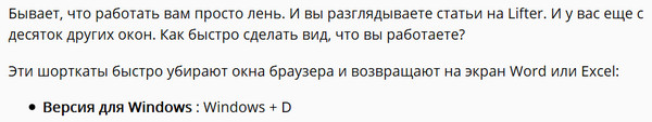 Собственно, пример. Последние пару дней далеко не от одного френда-френдессы прилетели лайки на чудесную статью в очередном "лифтере" - "7 сочетаний клавиш, которые изменят вашу офисную жизнь". Ну, казалось бы, чего проще написать статью о двести лет как известных полезных сочетаниях клавиш в том же Windows, которые жизнь-то не изменят, но при этом качество этой жизни явно улучшат.