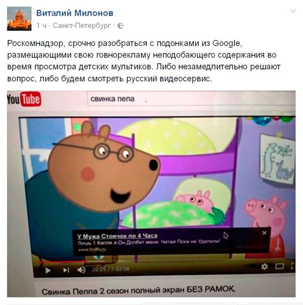 Суть же заключается в том, что у Google Adsense есть проблемы с модерированием рекламного контента. И вот эту "стоячки" у него изредка прорываются - обычно по выходным и вроде только на мобильных устройствах (мне пару раз присылали скриншоты того, как подобные баннеры показываются Гуглом на моем сайте). И, судя по всему, Google с этим делом так ничего и не сделал. Так что Милонов - Милоновым, Роскомнадзор - Роскомнадзором, а Гугл действительно надо пинать, чтобы они закрыли эту дырку. Причем там вылезает один и тот же "у мужа стоячок", и они с этим стоячком так и не могут справиться. Дурдом.