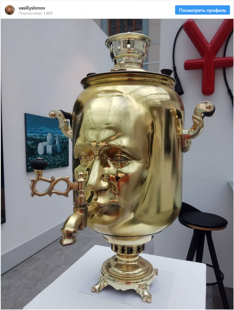 Красноярский художник Василий Слонов показал в Москве несколько своих новых работ — самовар с лицом президента, нестандартные огнетушители и писсуар с рогами. Все это было представлено на ярмарке современного искусства Cosmoscow-2019, которая проходила в галерее «11.12» с 6 по 8 сентября. (Отсюда.)