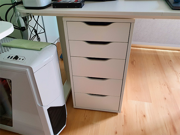 Третий ящик - всякие наушники. Куча. Включая беспроводные. Вот, думаю, наверное, разрядился кейс у беспроводных наушников и бжикает. Достал их, поставил перед собой. Со стороны тумбы опять - "Бжжж"... Значит, не наушники.