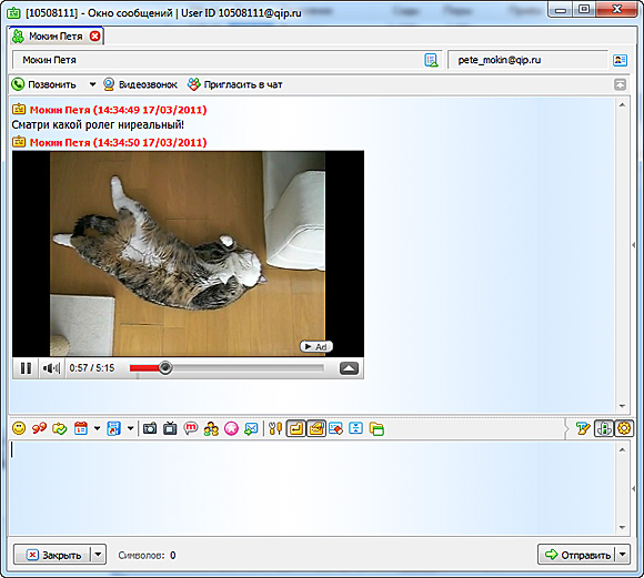 Установил QIP Infium версию 9044, а там очень прикольное нововведение: когда вам в диалоге чата кидают ссылку на ролик YouTube, он может воспроизводиться прямо в окне чата. Ну и, конечно, сохраняется сама ссылка, чтобы можно было посмотреть в браузере. Забавно выглядит.