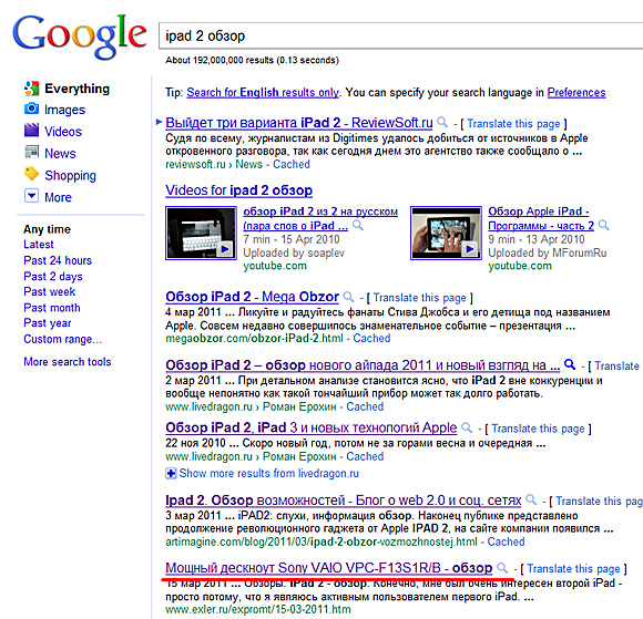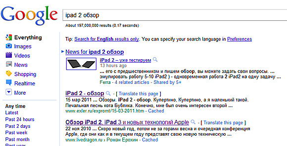 Upd: УЖЕ поменял. Все-таки Гугл - он очень шустрый. Респект и уважуха. "Яндекс" пока и не почесался. По этому запросу на первой странице выдает вторую часть моего обзора iPad.