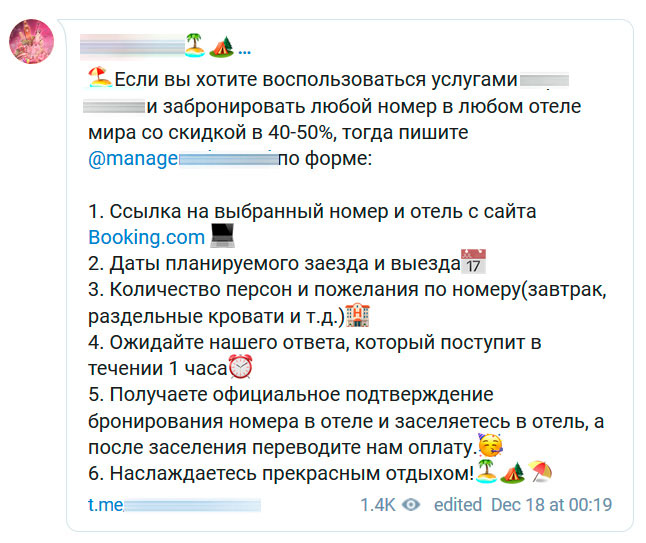 Вчера прислали. Есть такая группа в Телеграм. Название дублирует вполне респектабельную, насколько я мог судить, питерскую туристическую фирму. Скидка в 40-50% на цены в Booking невозможна в принципе (так же, кстати, как и скидка в 10%, потому что в Booking прямо предлагают: если найдете цену на этот отель дешевле, пришлите ссылку и мы забронируем по этой цене), поэтому развод из разводов.