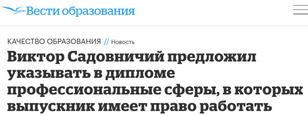 "Необходимо также, на наш взгляд, дополнительно обсудить целесообразность указания в приложении к диплому перечня видов и областей профессиональной деятельности, в которых выпускник имеет право работать. Эксперты отмечают, что такая детализация ограничит возможности выпускников в части дальнейшей профессиональной деятельности. Это были предложения от наших региональных советов", - сказал он на заседании Совета российского Союза ректоров в МГУ.