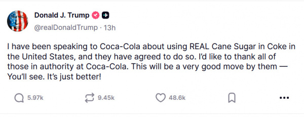 Я вел переговоры с компанией Coca-Cola об использовании НАСТОЯЩЕГО тростникового сахара в кока-коле в США, и они согласились это сделать. Я хотел бы поблагодарить всех ответственных лиц в Coca-Cola. Это будет очень хороший шаг с их стороны — вы сами увидите. Это просто лучше!