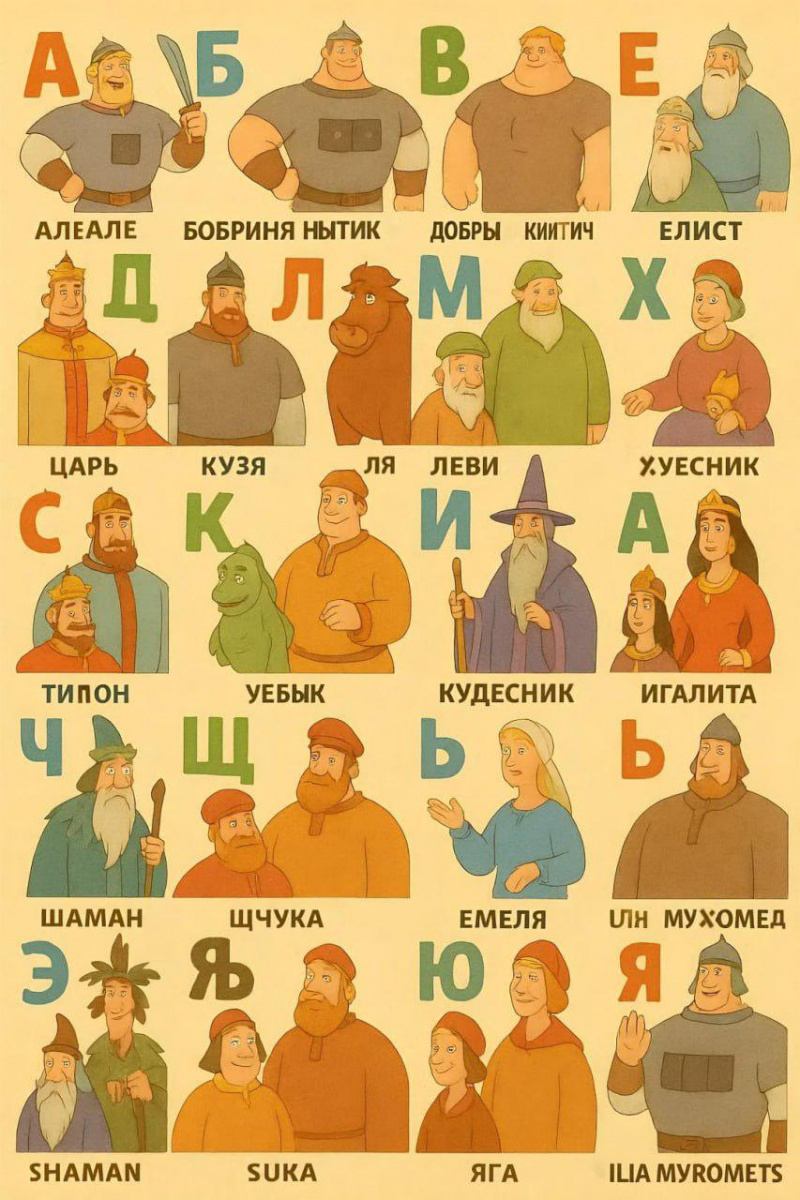 Попросил ChatGPT нарисовать русский алфавит с самыми известными деятелями России - их именами и изображениями.