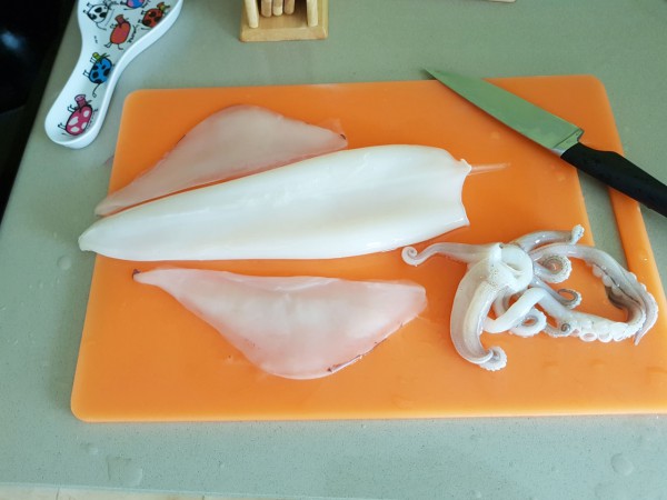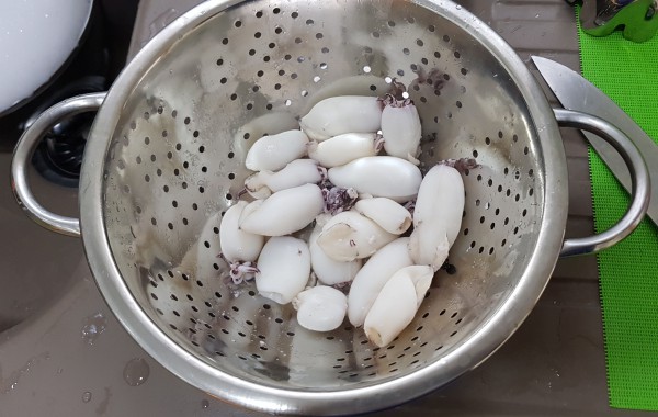 Однако! Свежий кальмар даже при таком способе обработки получается жестковатым. Нет в нем подлинной мягкости. Если его заморозить, то он станет заметно мягче, но покупать свежего, чистить, морозить, размораживать - на черта такие сложности, когда в магазинах полно замороженных кальмаров - чищенных и нечищенных. (И в России в том числе замороженные кальмары, насколько я помню, много где продаются.)