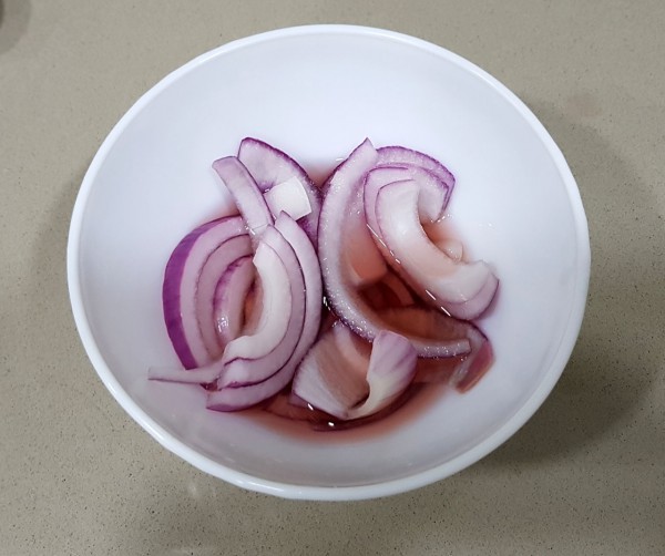 Занялся экспериментами. Ну, кальмары - оно понятно. Майонез домашний мы готовить уже умеем - вот как раз о нем было в предыдущем выпуске. Маринованный лучок продается в магазине, но нет никаких проблем его сделать самому - надо просто взять репчатый лук (мне больше всего нравится салатный фиолетовый), порезать на кружочки, обдать его кипятком - чтобы был не жгучий и не распространял сильное амбре, - после этого залить винным уксусом. У меня под это дело есть пластиковая круглая баночка - в ней эти кружочки в уксусе и хранятся. Одной луковицы хватает салатов на пять-шесть.