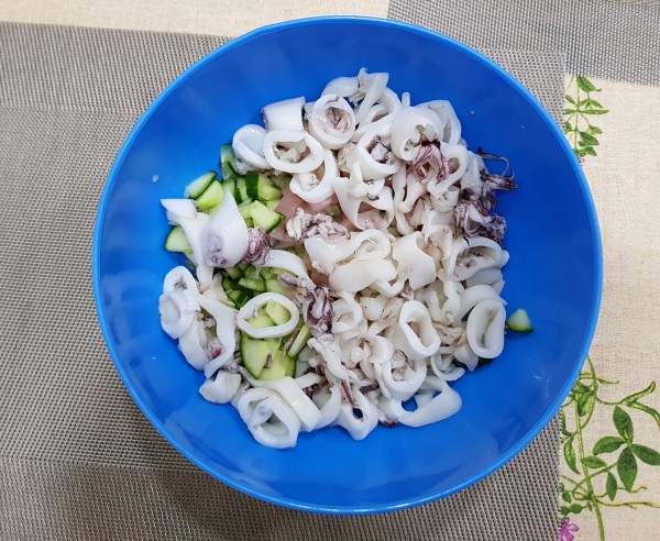 Можно делать просто кальмара с луком и заправкой, но с кальмаром также хорошо сочетается огурец, который идет наполнителем. Я на это количество беру один крупный огурец и стараюсь нарезать его как можно мельче. (На фото огурец нарезан не слишком мелко - я не сразу дошел до подлинного мастерства в нарезании огурца.)