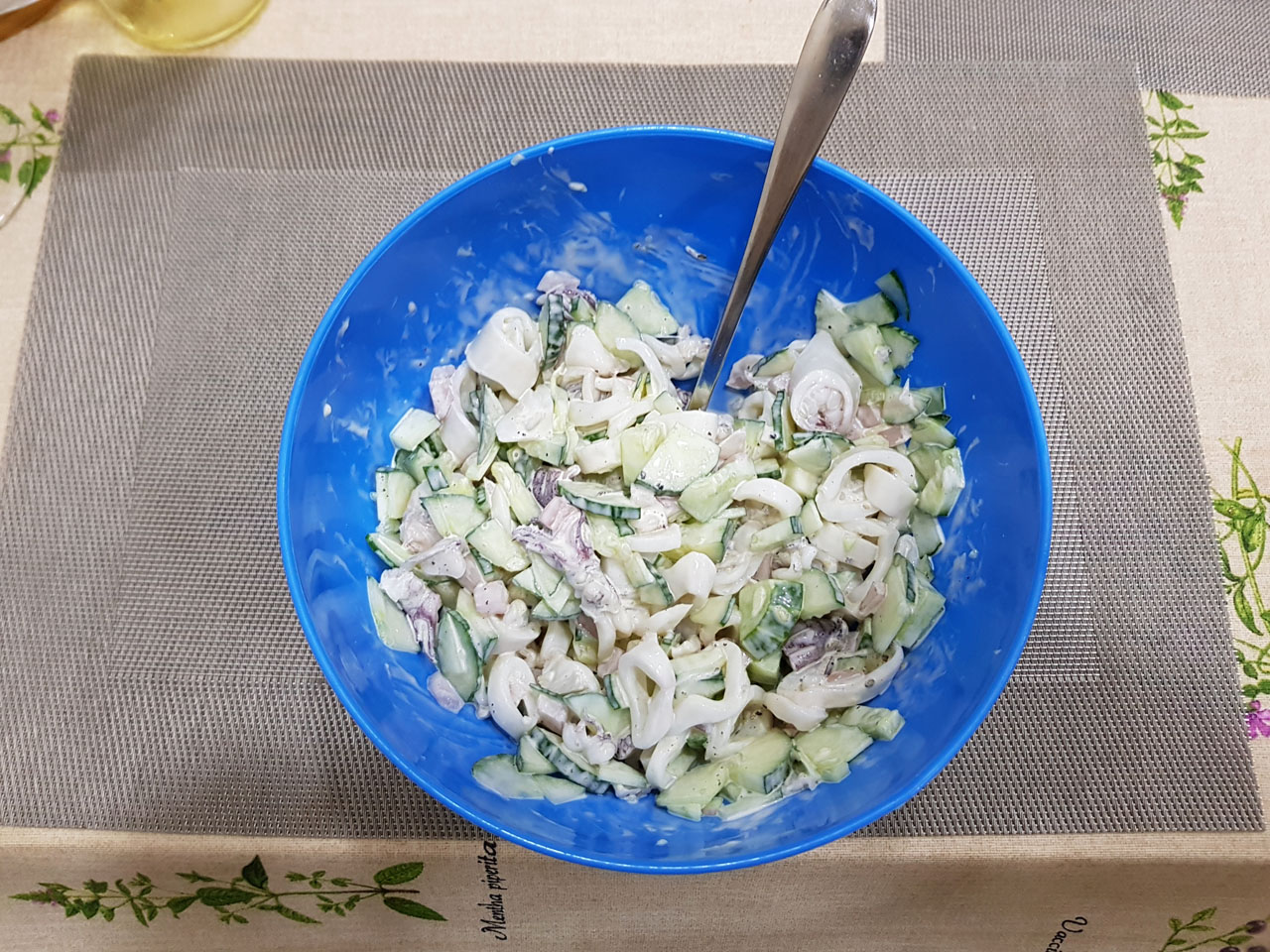 И тут очень удобно то, что порция майонеза делается на 5-6 салатов, лук маринуется на 5-6 салатов, кальмары прямо из морозилки варятся минут 6, огурец покрошить - пара минут во время варки кальмаров.