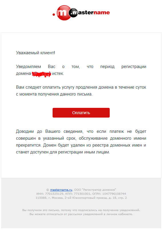 И тут хохма в том, что это его домен и срок регистрации действительно истекает. И письмо выглядит очень похожим на настоящее уведомление.