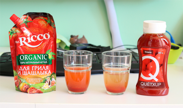 Капаем каждый кетчуп в свой стакан, добавляем воду.