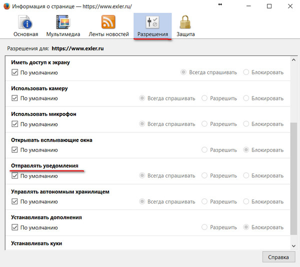 Если потребуется разрешить отправку уведомления для каких-то сайтов, то на нужном сайте ткнуть на значок i в кружочке в адресной строке, там в закладке "Разрешения" отметить нужный параметр.