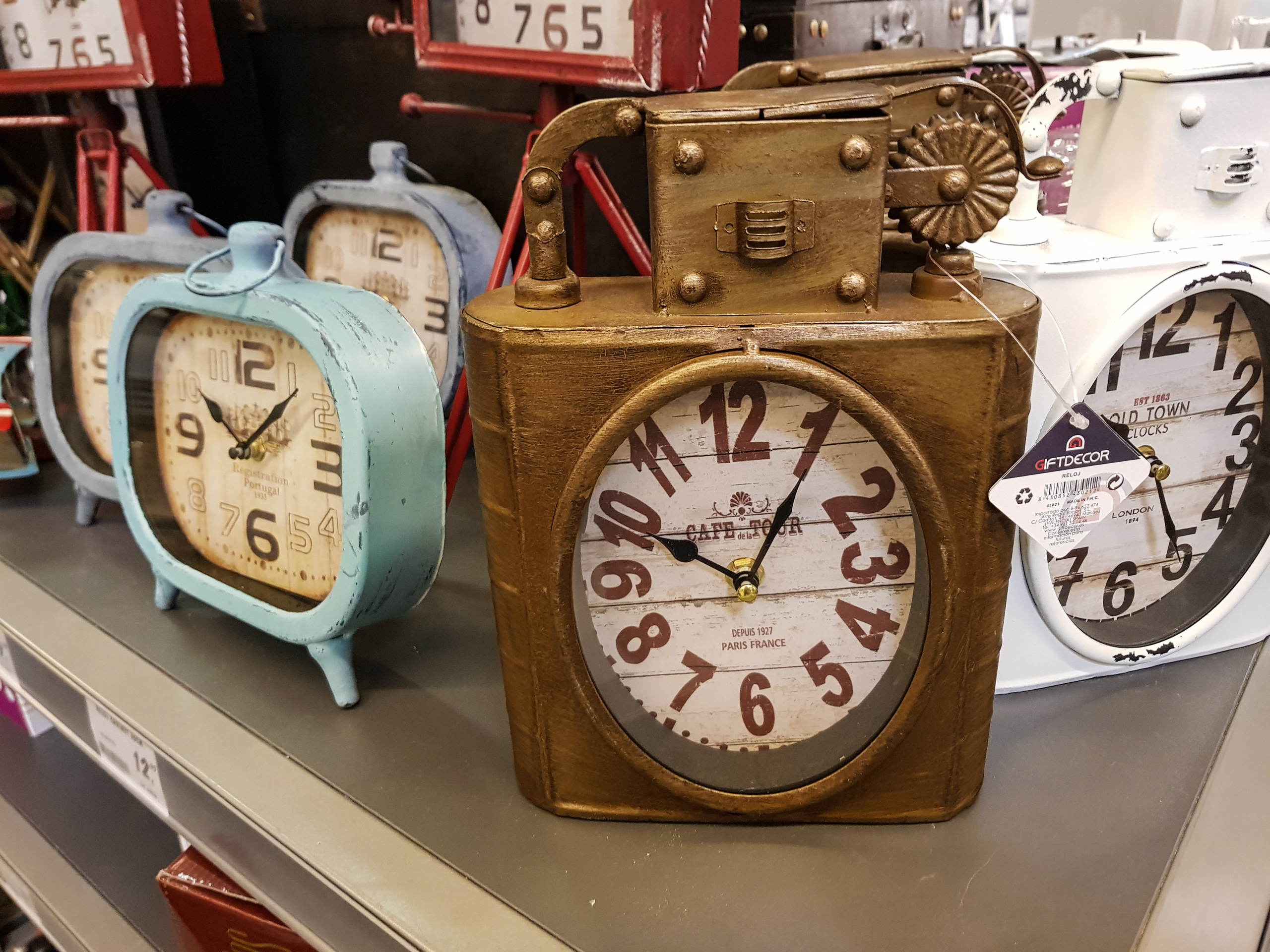 В Барселоне есть магазин под названием Conforama - там все для дома, все для семьи. И в нем есть отдел, в котором продают совершенно стимпанковые часы и другие предметы обихода. Часы, к сожалению, не на паровом ходу, но тем не менее - смотрите, какая прелесть. Прям страшно хотелось приобрести, но только некуда мне это поставить - у меня в кабинете все оформлено в тусклом офисном стиле, такие штуки там будут смотреться вызывающе.