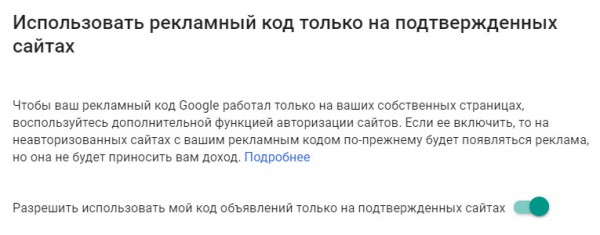 И там включить "Использовать рекламный код только на подтвержденных сайтах", потому что этот код по-умолчанию выключен.