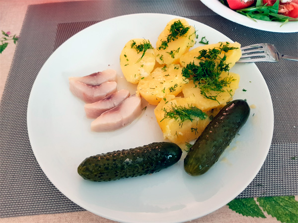 Ну и сегодня оттянулись по полной программе на обеде "а-ля рюсс": вареная картошечка с маслом и укропом (укроп тут тоже поди найди), огурчики, селедочка - красота.