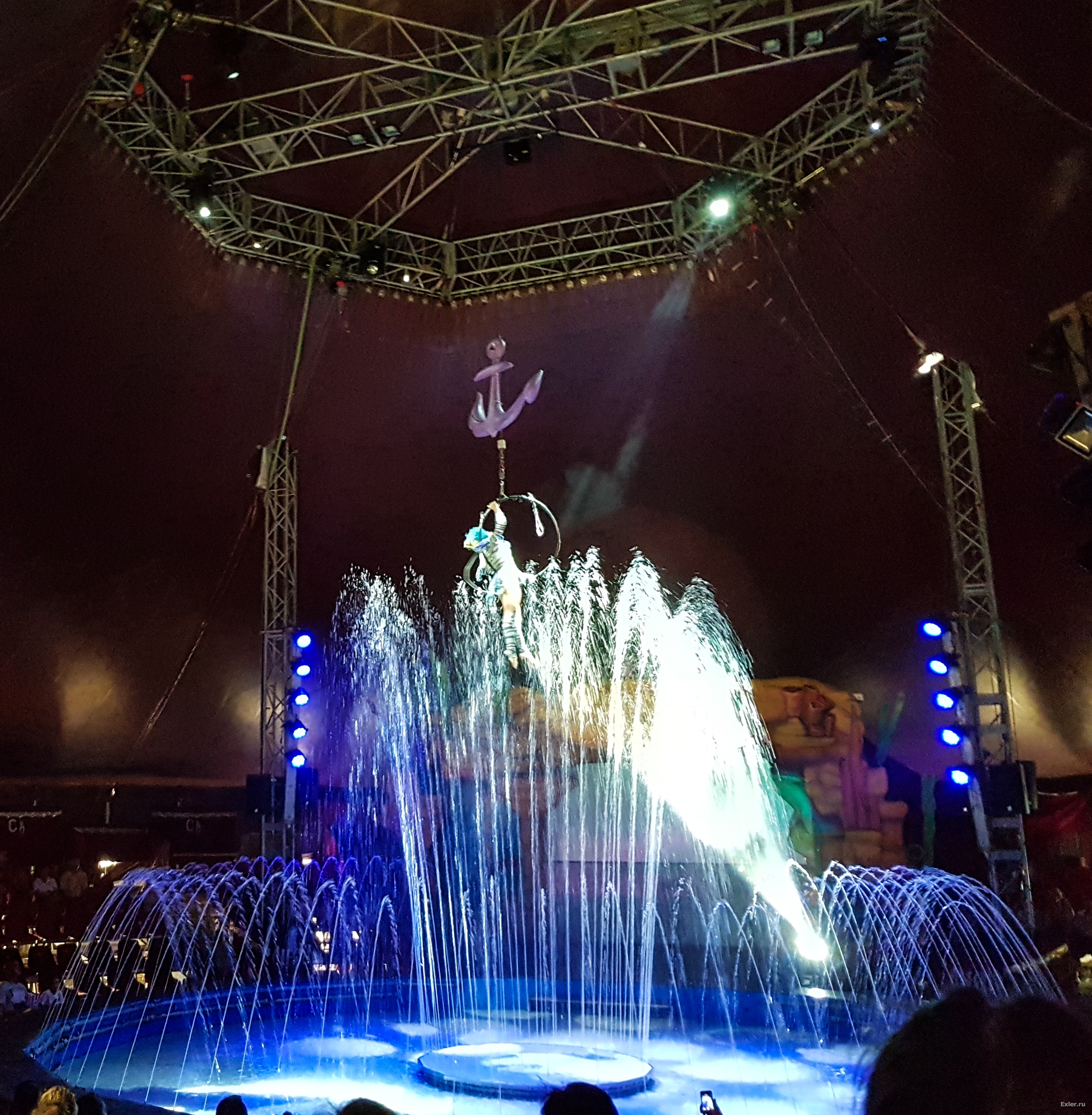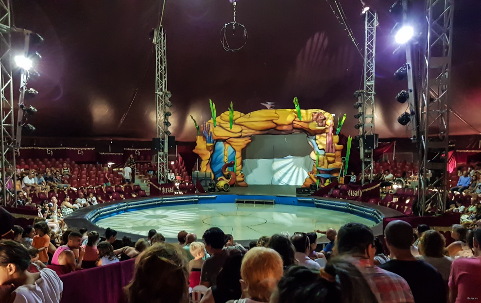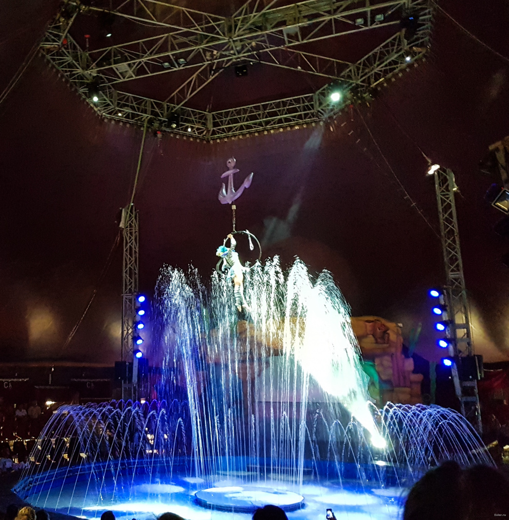 На этот раз обещали не просто цирк, а аж водную феерию. Купол возвели солидный, с сиденьями амфитеатром - это вам не какой-то домашний цирк.