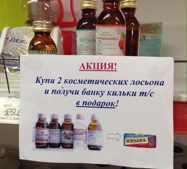 А что, действительно - гении маркетинга! Лосьоны ведь надо чем-то закусывать, а тут готовый закусон. Кроме того, килька сто процентов просроченная (иначе бы бесплатно не отдавали) - значит, в аптеке придется покупать имодиум. А он дорогой. Так что всем профит со всех сторон.