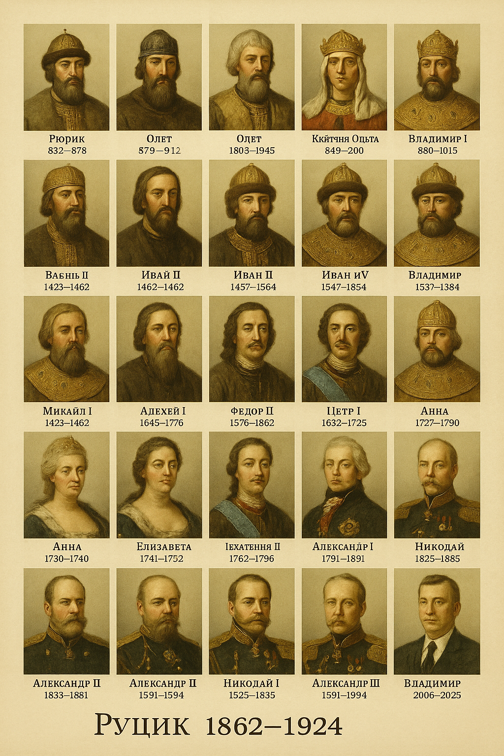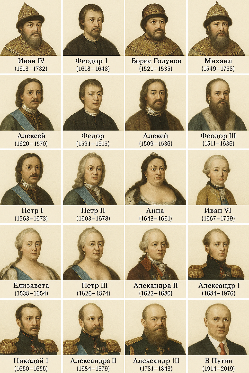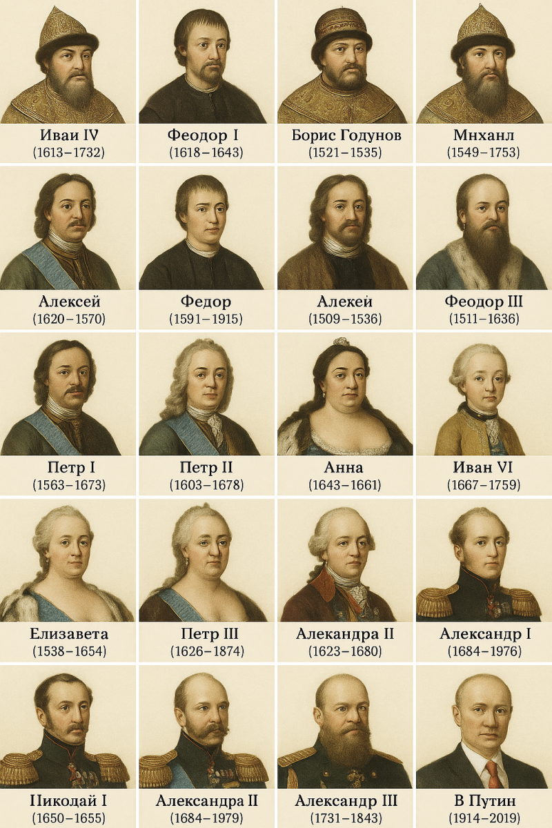 Попросил ChatGPT сгенерировать изображение всех российских царей с указанием их имен и периодов правления.