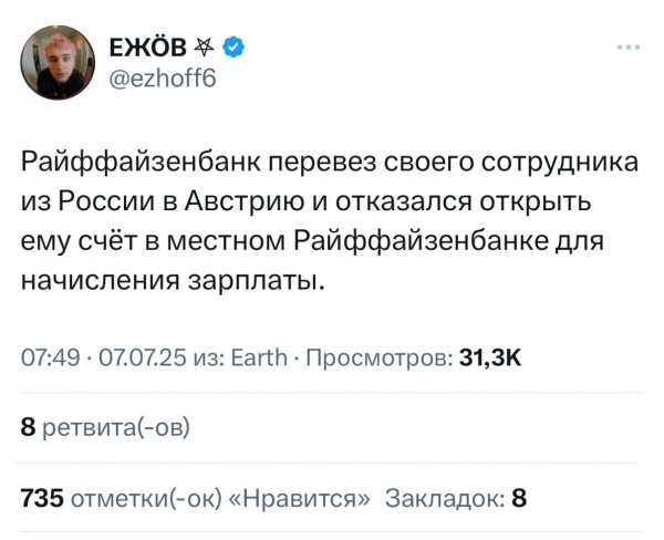 Двенадцать дней, пока Израиль решал иранский вопрос плюс отработка по ядерным объектам американскими В- 2 в украинской блогосфере наблюдалось небольшое затишье. Сейчас все началось по-новой с удвоенной силой. Трамп не дал то, Трамп не дал это. Трамп где ракеты- стоит буквально пригожинский крик. Макрон- где ракеты, Стармер- где ракеты, что-то такого крика я не слышал. Никто не задаётся вопросом почему за десятки лет безбедного существования эти достойные страны НАТО не смогло создать современные средства ПВО. Как и никто не задаётся вопросом почему за 30 лет самостийности, Украина умудрилась просрать всю свою оборонку. Уже не говоря о том, не дай бог Трамп пообщается по телефону с Путиным. Французским можно, немецкие пусть говорят а Трамп в очередной раз становится врагом рода человеческого. Мгновенно.
